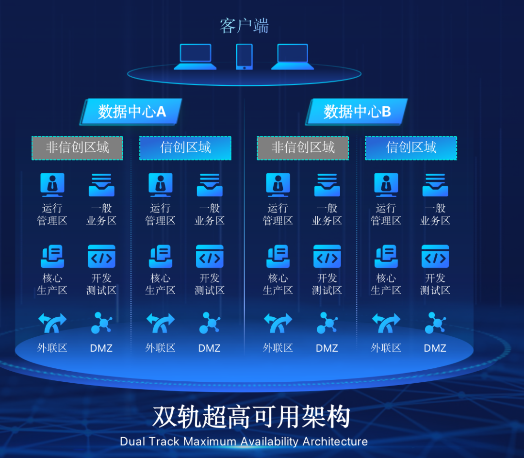 PA视讯PlayAce在企业面临自主创新IT基础重构过程中,推出的全新架构双轨超高可用架构(简称DTMAA),在双活数据中心的分区调度基础上,添加每个数据中心内信创域和非信创域的分域调度,来实现分区分域协同的多活双轨超高可用。